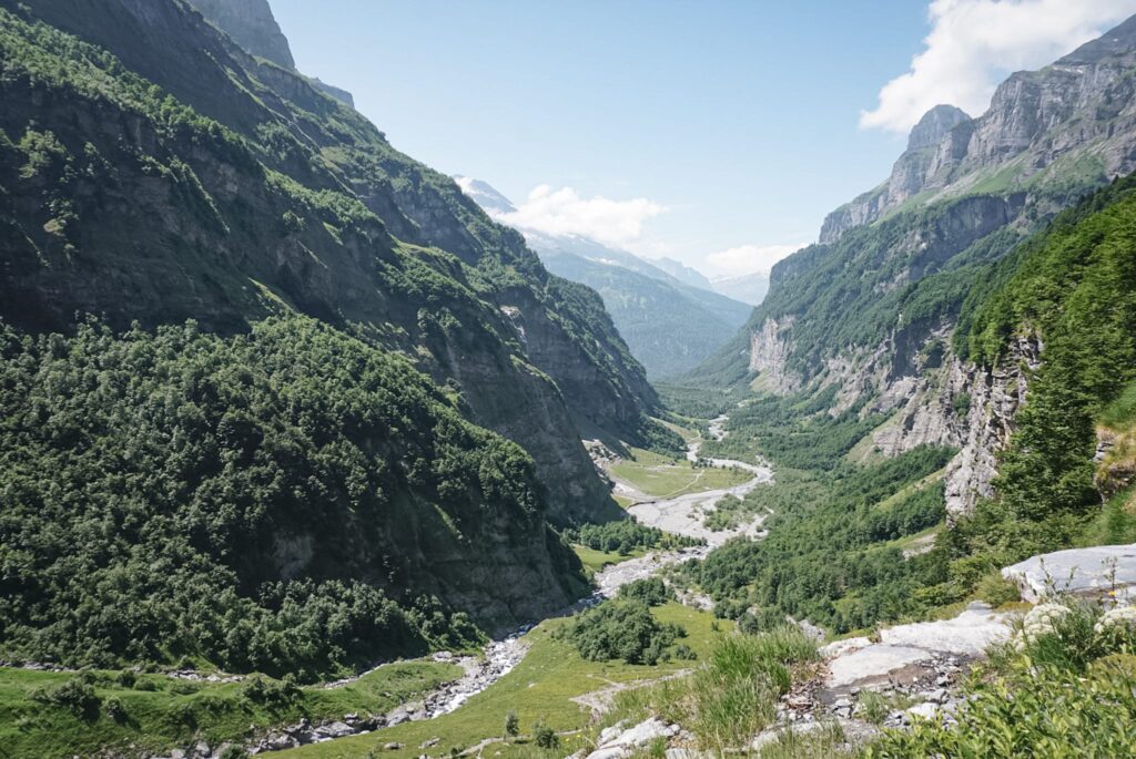 Het pad stijgt licht en al snel wandel je het bos in. Tussen de bomen door krijg je af en toe prachtige doorkijkjes naar de vallei en de stromende beekjes beneden. De eerste anderhalve kilometer voert door bos, maar zodra de bomen wijken, zie je in de verte de hoge toppen van het einde van de vallei opduiken.