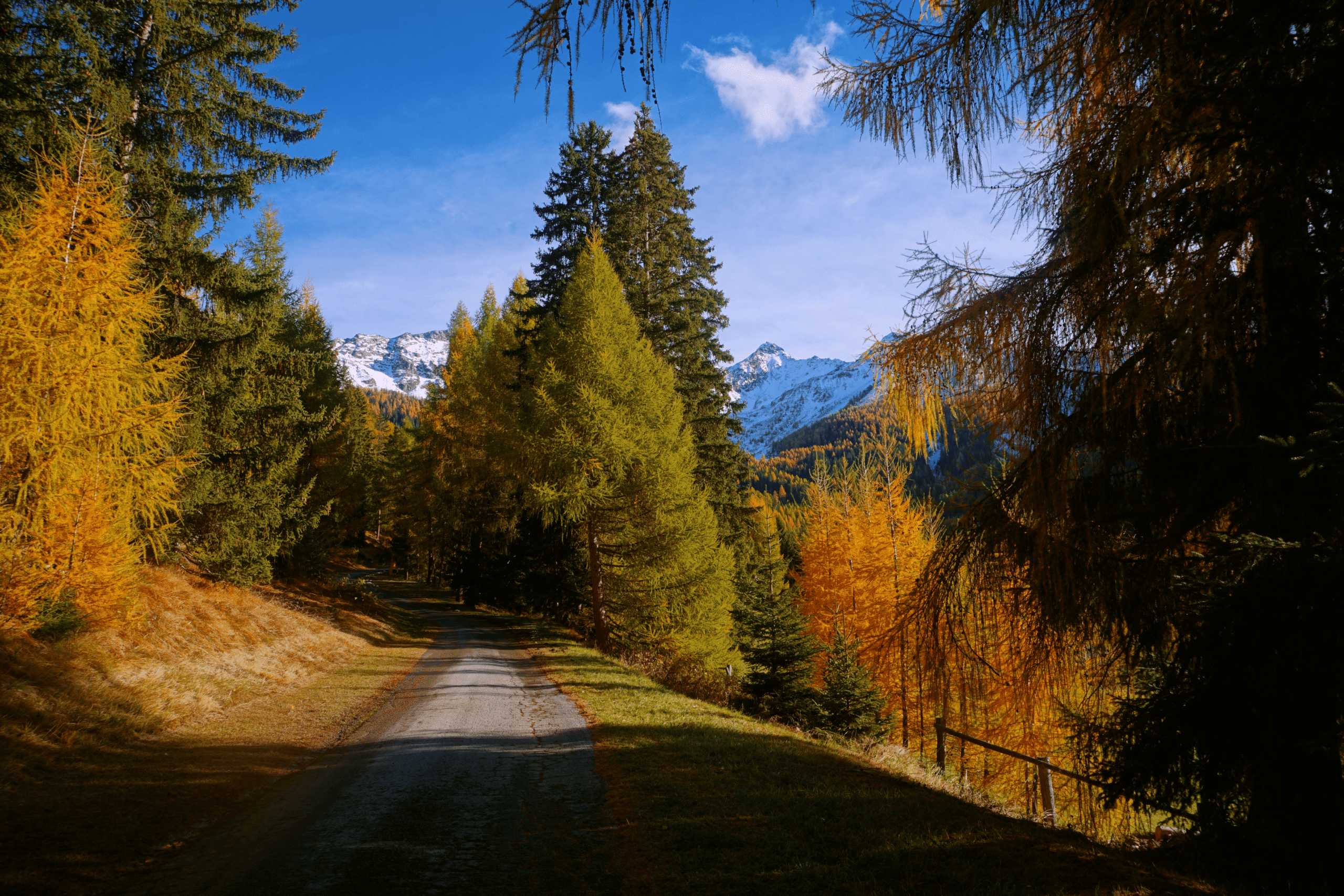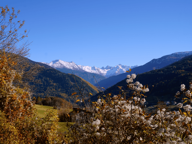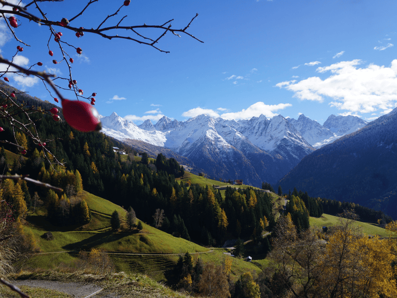 Bijna illegaal mooi. Zo’n plek waarvan je je afvraagt waarom er geen rijen mensen staan om foto’s te maken. Je kijkt uit over een groene, glooiende kom met slingerende weggetjes en bomen in alle herfstkleuren. En daarachter: de toppen van de Kaunergrat, al bedekt met een eerste laag sneeuw. Echt een uitzicht dat blijft hangen.