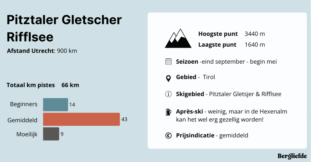 Het gebied is overzichtelijk en kleinschalig, maar biedt toch voldoende variatie. De Pitztaler Gletsjer is verbonden met het lager gelegen Rifflsee, waar je meer mogelijkheden vindt voor beginnende wintersporters. De twee delen zijn comfortabel met elkaar verbonden via een ondergrondse trein. In hetzelfde dal ligt ook skigebied Hochzeiger met ongeveer 40 kilometer aan pistes. Dit gebied is niet standaard inbegrepen bij je skipas, maar boek je een pas voor vier dagen of langer, dan krijg je ƩƩn dag toegang tot Hochzeiger erbij.