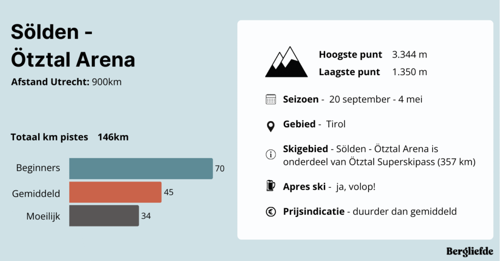 Sƶlden is een van de bekendste skigebieden in Oostenrijk ā en met recht. Dankzij de gletsjers Rettenbach en Tiefenbach geniet je er van oktober tot mei van uitstekende sneeuwzekerheid. Het behoort tot de Ćtztal Arena en telt 145 km aan pistes, variĆ«rend van brede oefenhellingen tot uitdagende zwarte afdalingen. Met een skipas van drie dagen of langer krijg je bovendien toegang tot naburige, even sneeuwzekere gebieden zoals Hochgurgl-Obergurgl, Vent, Kühtai en Hochoetz. Sƶlden is erg goed bereikbaar vanuit Nederland, het ligt slechts op een uurtje vanaf Innsbruck. Het gebied beschikt over moderne faciliteiten, waaronder koelmatten op lagergelegen pistes, zodat je zelfs bij warmere omstandigheden de dalafdaling kunt maken.