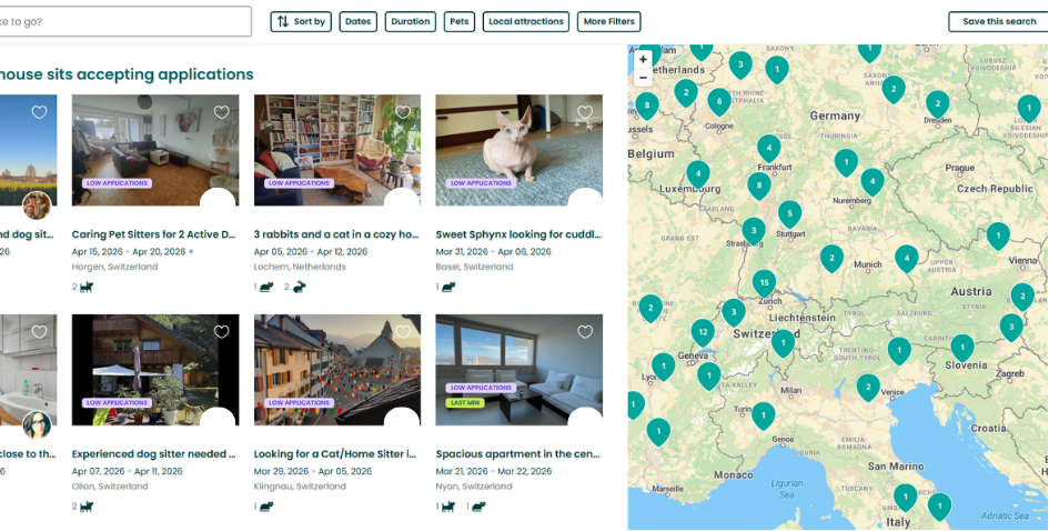 Om daadwerkelijk te kunnen reageren op housesits, moet je eerst een account aanmaken. Daarover later meer. Als je eenmaal een account hebt, kun je via de kaart op zoek gaan naar regio’s waar je graag zou willen verblijven. Je ziet hier verschillende oproepen van huiseigenaren die op zoek zijn naar iemand om voor hun huisdieren te zorgen, en het tijdsbestek waarvoor ze iemand zoeken.